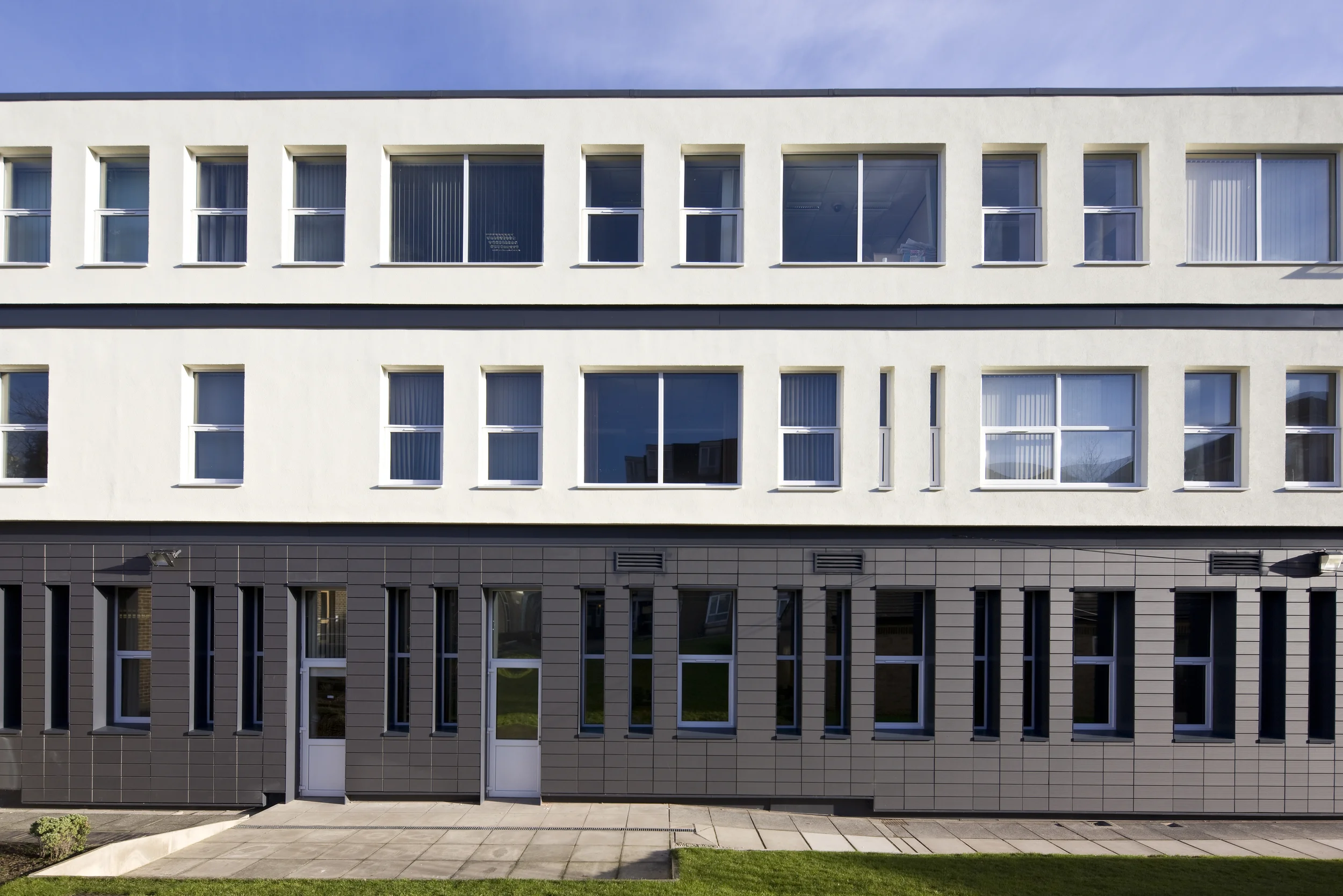 In order to minimise disruption within the building, the solution was to apply insulation to the exterior façade including a dual finish of Render to the upper levels and grey terracotta rainscreen to lower floors.